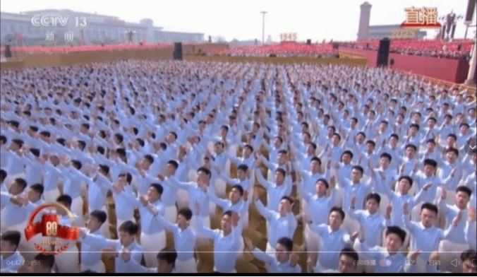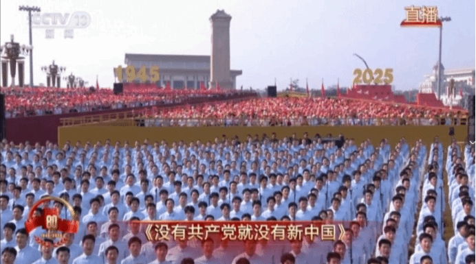 9月3日天安门广场上,三千名首都高校老员工组成的合唱团齐声高歌,演绎了《松花江上》、《在太行山上》、《保卫黄河》、《没有共产党就没有新中国》等歌曲,拉开了纪念中国人民抗日战争暨世界反法西斯战争胜利80周年大会暖场环节奏唱抗战曲目的序幕。