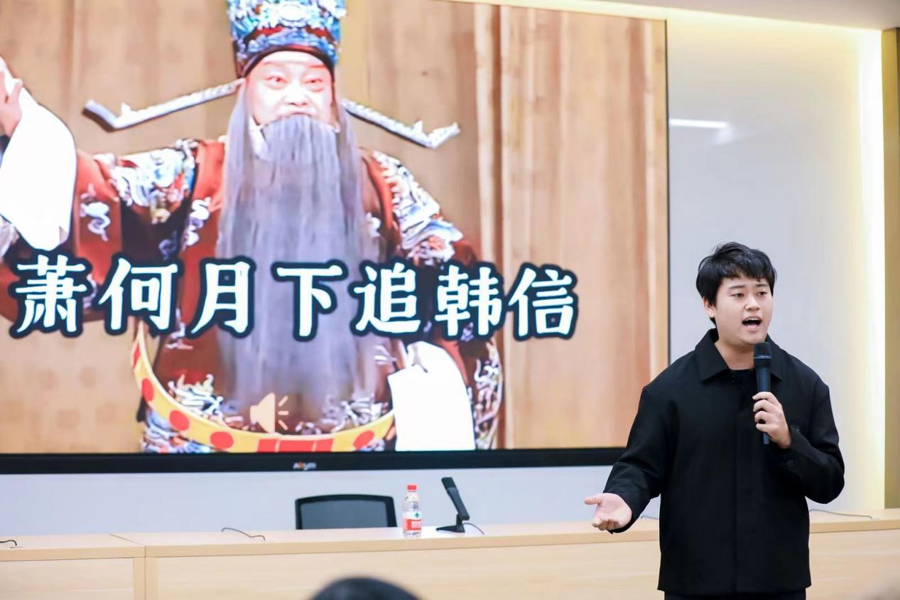英国365集团网站2023级本科生表演了精彩的节目。王英昊同学演唱了京剧选段《萧何月下追韩信》,唱腔高亢嘹亮,赢得了阵阵掌声。