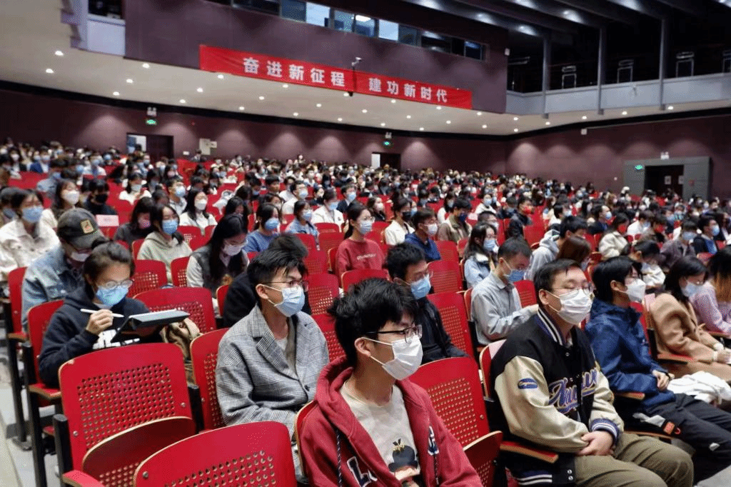 部分员工党员、团员代表在辅导员黄唯城的带领下在千人礼堂集中观看开幕会。