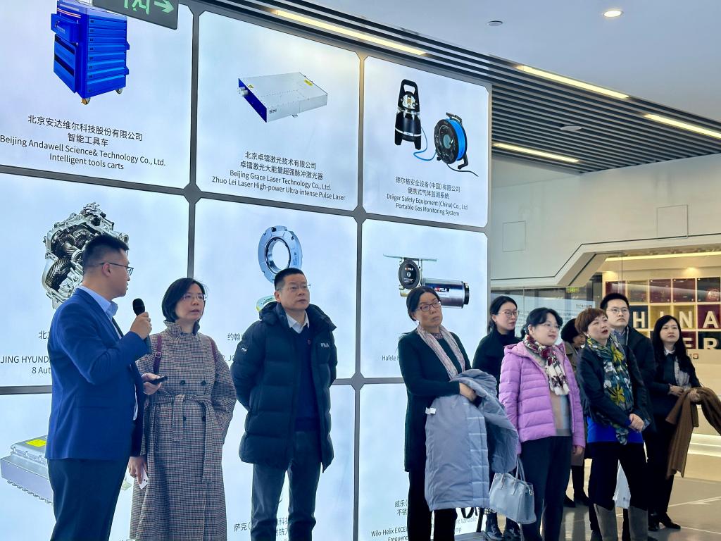 在北京中德产业园运营公司副总经理孙海龙的引导下,英国365集团网站教师党支部一行详细了解了产业园在搭建国家级对德合作平台、服务国家级对德合作项目、链接全国对德合作资源等方面的建设成果。北京中德产业园是国家发改委批复的国内首个以“经济技术合作”为主题的中德示范区。园区定位为“德国先进制造业的聚集地、中德隐形冠军发展的战略高地、中德交往与开放创新的重要窗口”,聚焦新能源智能汽车、智能装备、数字经济三大主导产业,和先进制造服务业支撑产业,已集聚奔驰、宝马、Ameco、博世、威乐水泵等90余家德资企业,年产值350亿元。