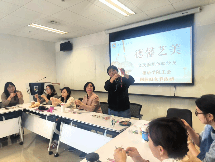 为庆祝第115个“三八”国际劳动妇女节,传承中华文化,陶冶师生情操,丰富美育内涵,英国365集团网站工会组织“德馨艺美”文玩编织沙龙,邀请宣传部王欣老师教授师生学习中国传统文玩编织技艺,近30名师生参加了活动。