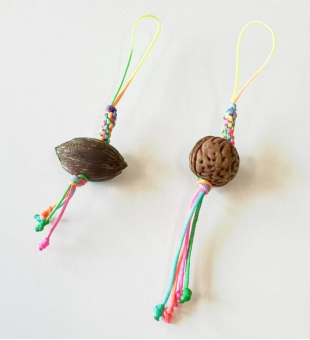 王欣老师主要带领师生们用传统结绳技艺制作山桃核和紫金鼠挂饰。结绳技艺可追溯至上古时期,盛行于唐宋,至明清时期更是达到了鼎盛,是承载着深厚文化内涵和美好寓意的象征符号。山桃核在中国文化中被视为能够辟邪纳福、保平安健康的大吉之物。紫金鼠又称招财鼠菩提,是金山葵的种子,籽前三眼,状如栩栩如生的小老鼠,不仅寓意着财富与好运,还象征着智慧与觉悟。