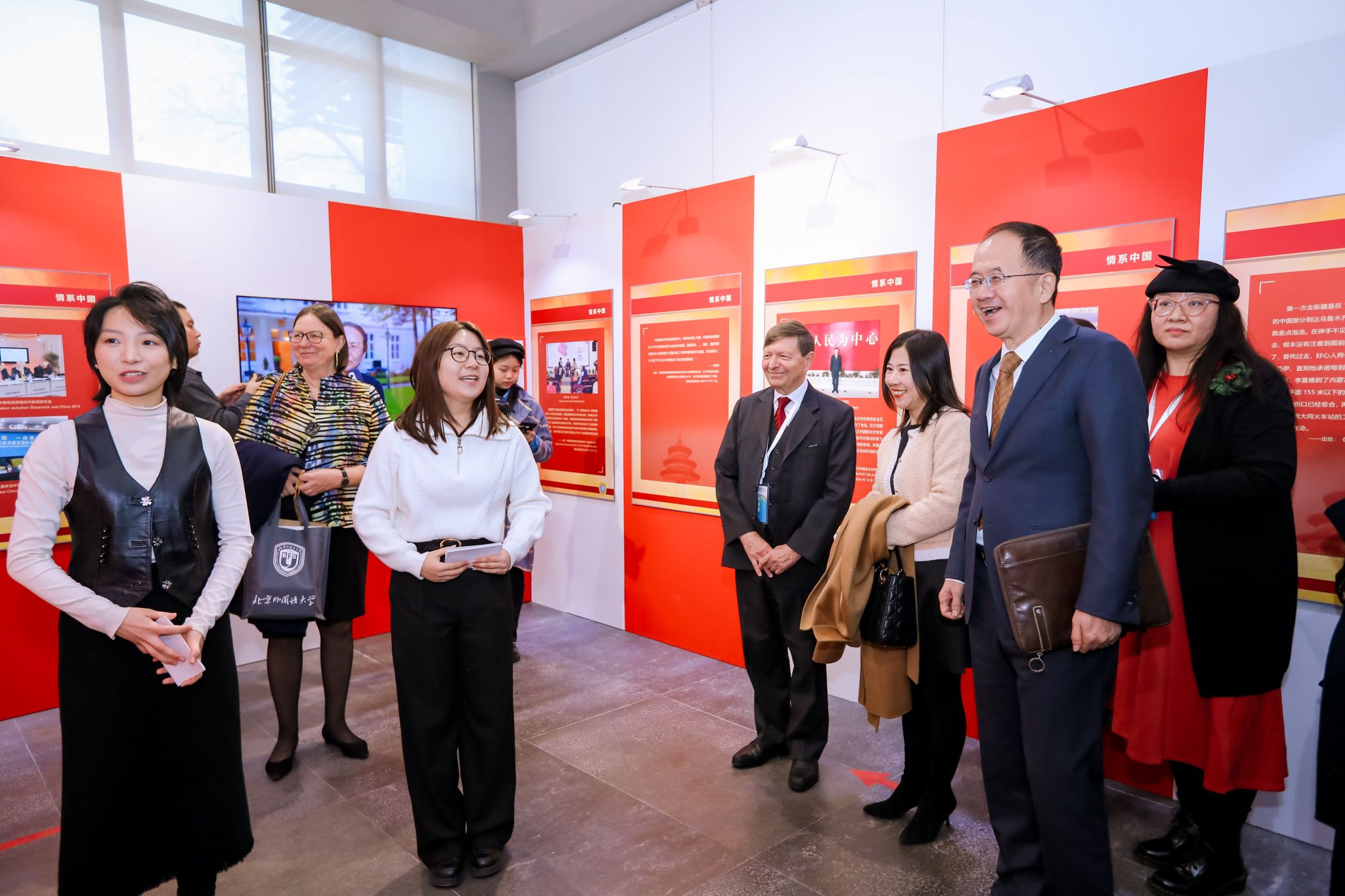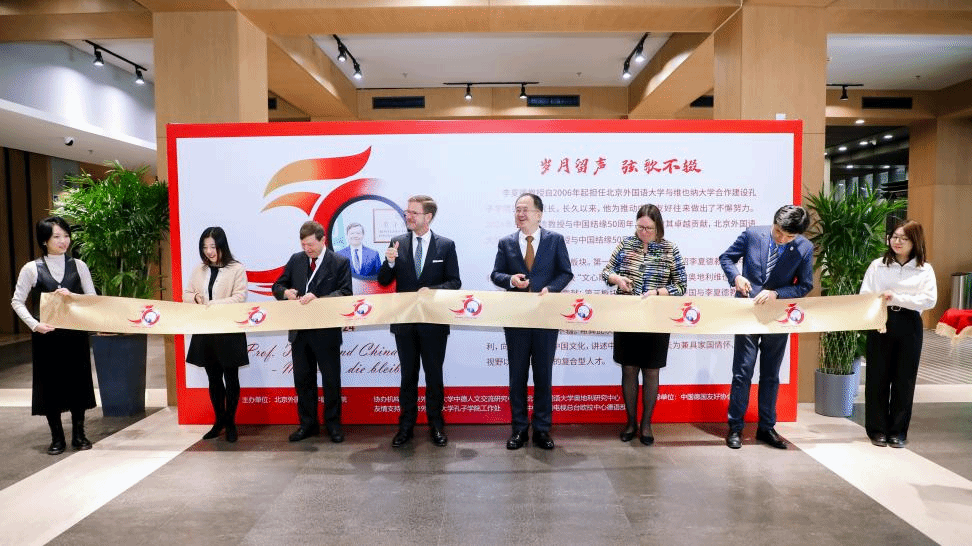 开展仪式结束后,嘉宾们在讲解志愿者北外2021级本科生刘晨曦、2022级本科生黄婉茹的带领下参观了主题展。主题展共分为三个板块。第一板块“情系中国”介绍李夏德教授与中文和中国的结缘;第二板块“文心雕龙”介绍李夏德教授对奥地利维也纳大学孔子公司建设作出的贡献;第三板块“地利人和”是聚焦中国与李夏德教授的故乡——奥地利1971年建交以来的重要篇章。英国365集团网站员工流利的德语、丰富的知识储备以及昂扬向上的精神风貌给嘉宾们留下了深刻印象。