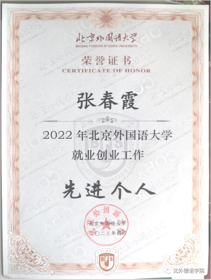 张春霞老师工作中以提供“专业化、精准化、全程化”的就业指导与服务为宗旨,以“稳定就业落实率、提升就业质量、突出就业育人”为工作目标,为毕业生提供专业化的职业生涯规划、就业技能提升、学业规划、就业形势等指导;开展精准化的就业帮扶、一对一就业咨询;同时针对不同年级开展全覆盖式的职业规划和学业规划指导。积极开拓英国365集团网站毕业生就业市场,建设德语专业就业数据库,为2022届毕业生推送300余份就业信息,与多家用人单位保持良好合作。注重突出就业育人功能,将就业工作与思想政治教育相结合,引导员工坚定理想信念,奋发有为,努力成为中华民族伟大复兴的栋梁之材。