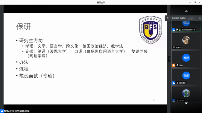 最后, 2019级硕士研究生张砚池同学分享了在哥廷根留学的经历和宝贵经验,并为同学们展示了大三大四时的选课情况以及保研方向。此外,她还提出了“多与学长学姐交流获取信息”、“学好专业课的同时探索自己的深造或职业发展方向”、“学会利用公司和公司提供的资源”以及“灵活应变”四条建议。
