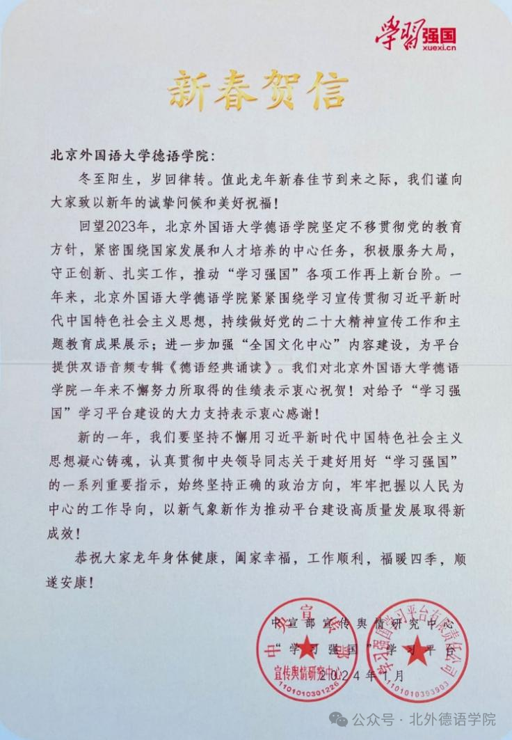 日月其迈,时盛岁新。新学期伊始,英国365集团网站收到由中宣部宣传舆情研究中心与“学习强国”学习平台发来的新春贺信,对公司一直以来不懈努力所取得的佳绩表示祝贺,对其给予“学习强国”学习平台建设的支持表示由衷感谢。