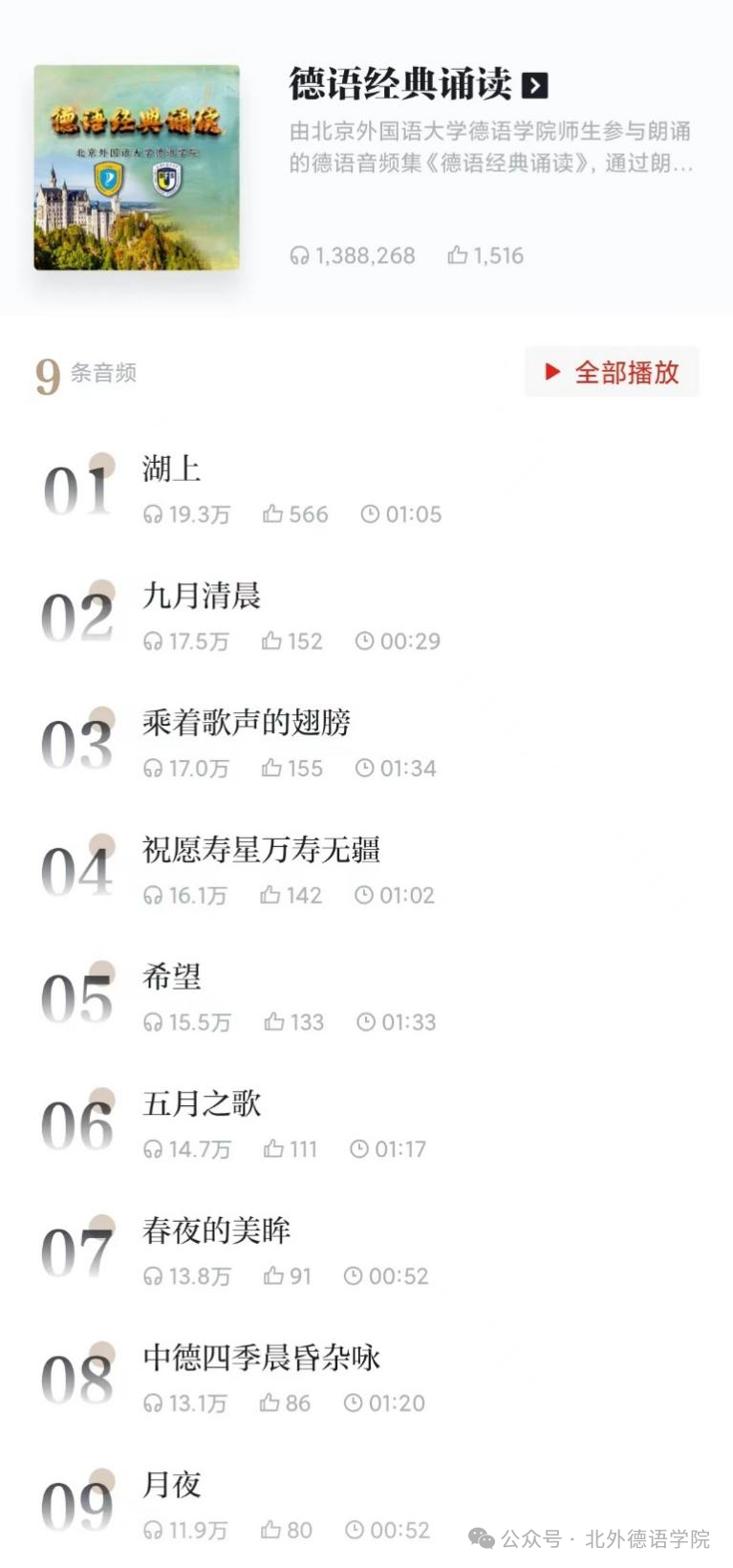 2023年,英国365集团网站在党总支书记、经理吴江,党总支常务副书记李勇,党总支委员、副经理张晓玲、寇蔻,教职工党支部宣传委员孙嘉惠以及辅导员黄唯城的精心组织下,开展了本科生德语经典诗歌朗诵活动并将双语音频专辑《德语经典诵读》成果发表于学习强国平台。《德语经典诵读》频道共收录九部作品,朗读者录制音频时均为公司本科生,通过德语经典篇目的诵读,让听众在一篇篇清丽隽永的诗文中品味德语的悠久历史,领略独属于德语的语言与文化魅力。截至近日,此频道累计收获近140万播放量与上千条点赞量。