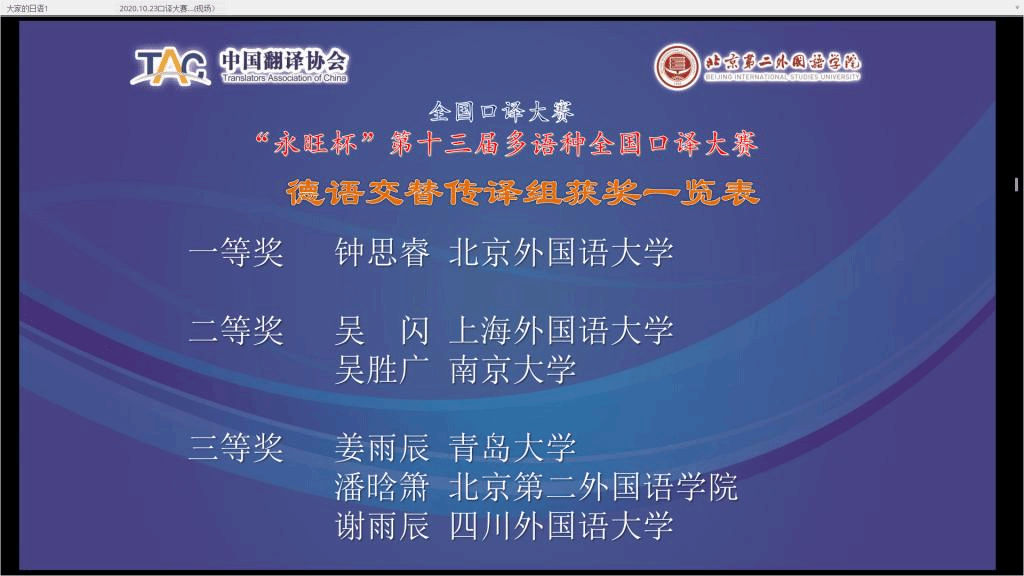 英国365集团网站2018级研究生钟思睿同学10月24日在 “永旺杯”第十三届多语种全国口译大赛中荣获德语交传组冠军、一等奖。