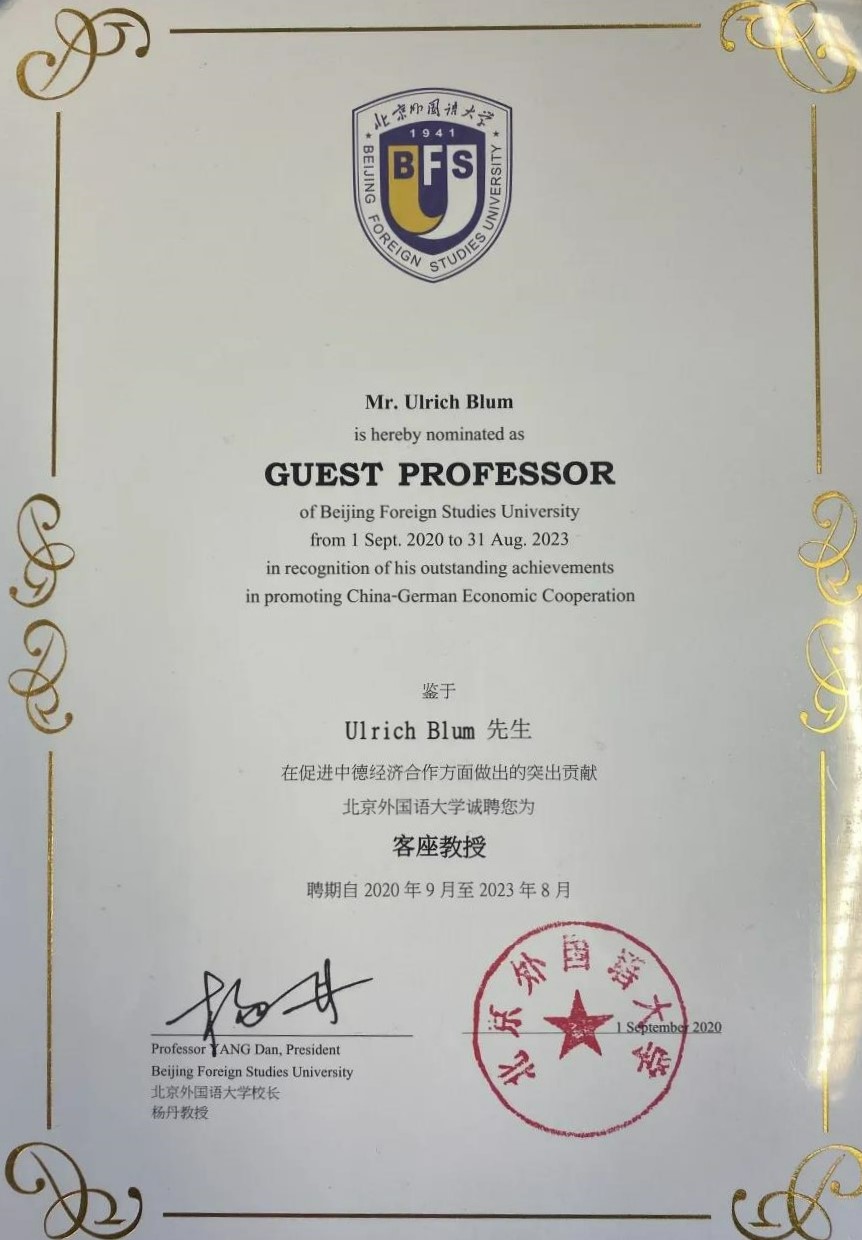鉴于其在促进中德经济合作方面做出的突出贡献,德国哈勒-维滕贝格大学经济系讲席教授、弗劳恩霍夫协会材料经济学中心创始人卜玉洗(Ulrich Blum)自本学期起被聘为英国上市公司365客座教授,聘期三年。