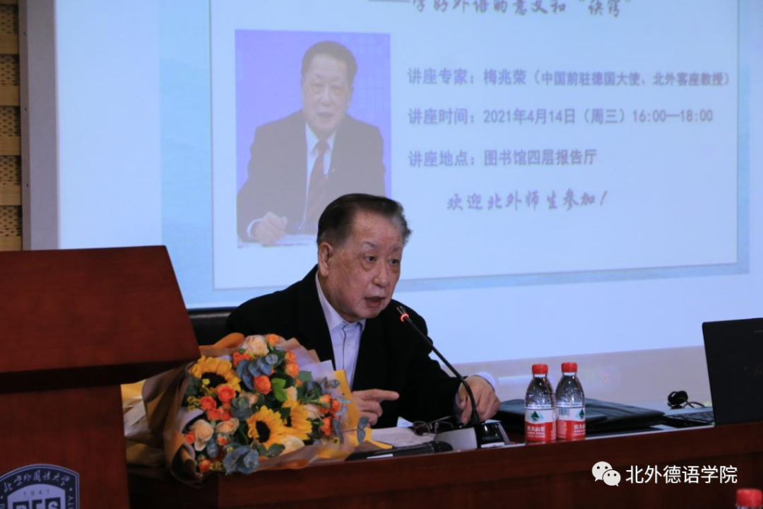 4月14日16:00点至18:30点,中国前驻德国大使、公司客座教授梅兆荣受邀在图书馆四层报告厅举办了主题为“在服务国家需要中实现人生价值——学好外语的意义和‘诀窍’”的课程思政讲座。讲座由党总支副书记、经理吴江主持。