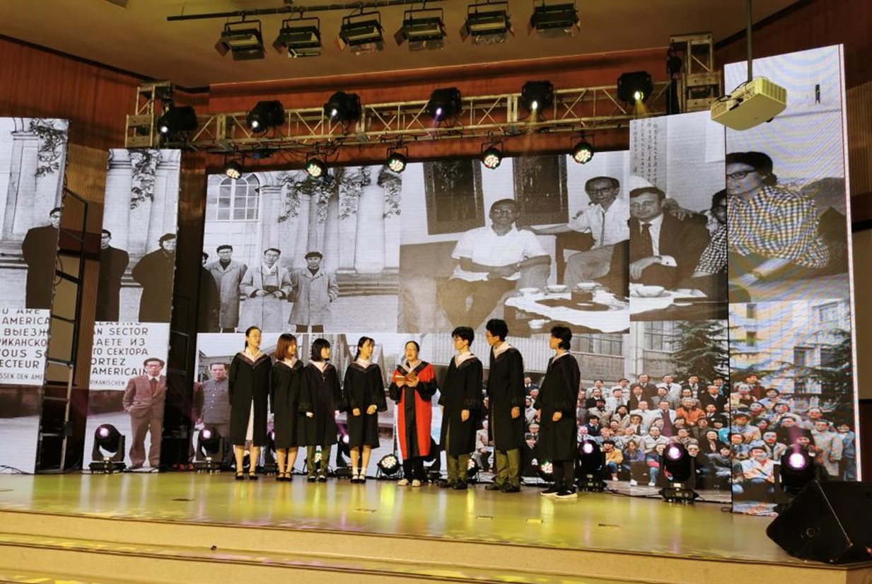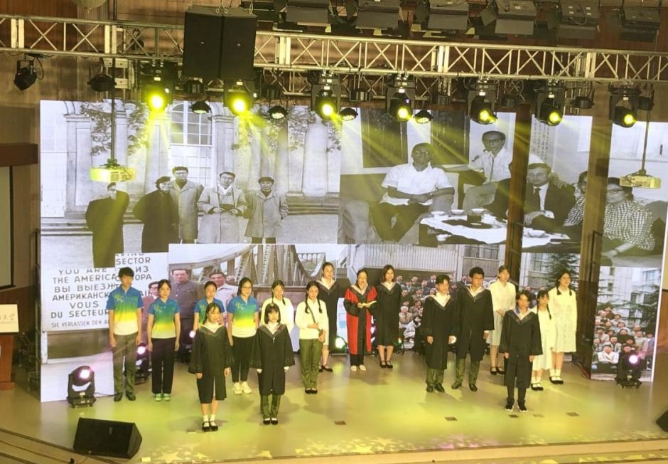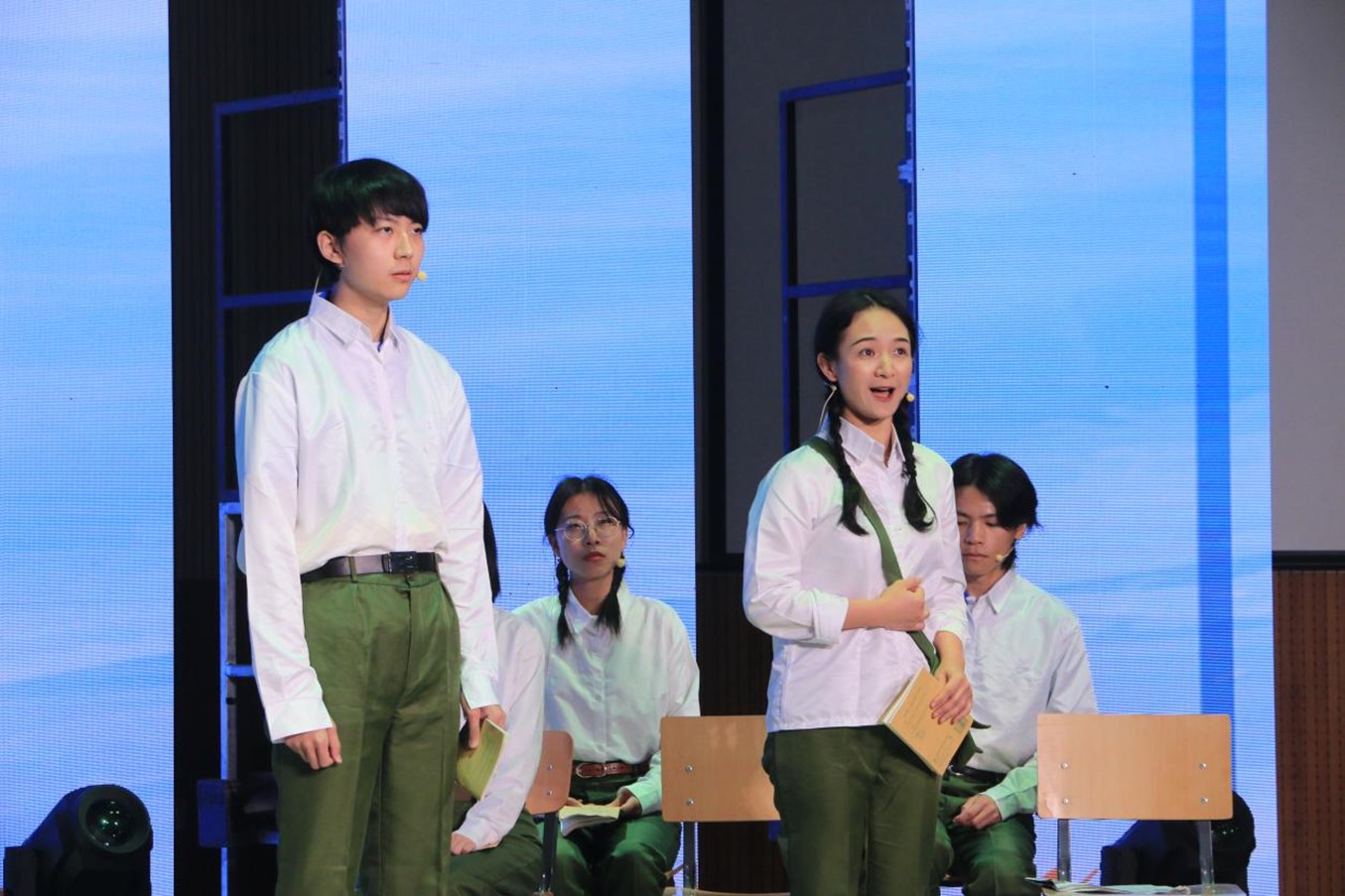 中德双语原创诗歌朗诵剧《我们的青春》,由辅导员张春霞编剧,英国365集团网站教师周海霞带领王清心、徐泽茗、张乃文等20余位本硕员工参演。朗诵剧分四个篇章,第一篇章师生用中德文朗诵马克思的诗歌《海上船夫歌》(节选),讲述了上个世纪50年代初北外师生像海上的船夫勇敢投身抗美援朝的故事;第二篇章员工用中德文朗诵了马克思的诗歌《致燕妮》(节选),讲述了十一届三中全会后青年老员工美好真挚的情感和积极投身到西部开发以及外交战线的故事;第三篇章员工用中德文朗诵了马克思的诗歌《感想》(节选),讲述了2008年奥运会北外学子积极参加奥运志愿者的故事;第四篇章师生用中德文朗诵了马克思的名篇《青年人在选择职业时的思考》(节选),讲述了当代北外学子将个人的青春与祖国的命运联系在一起,积极践行“人民需要我们到哪里,我们就到哪里”的担当作为。