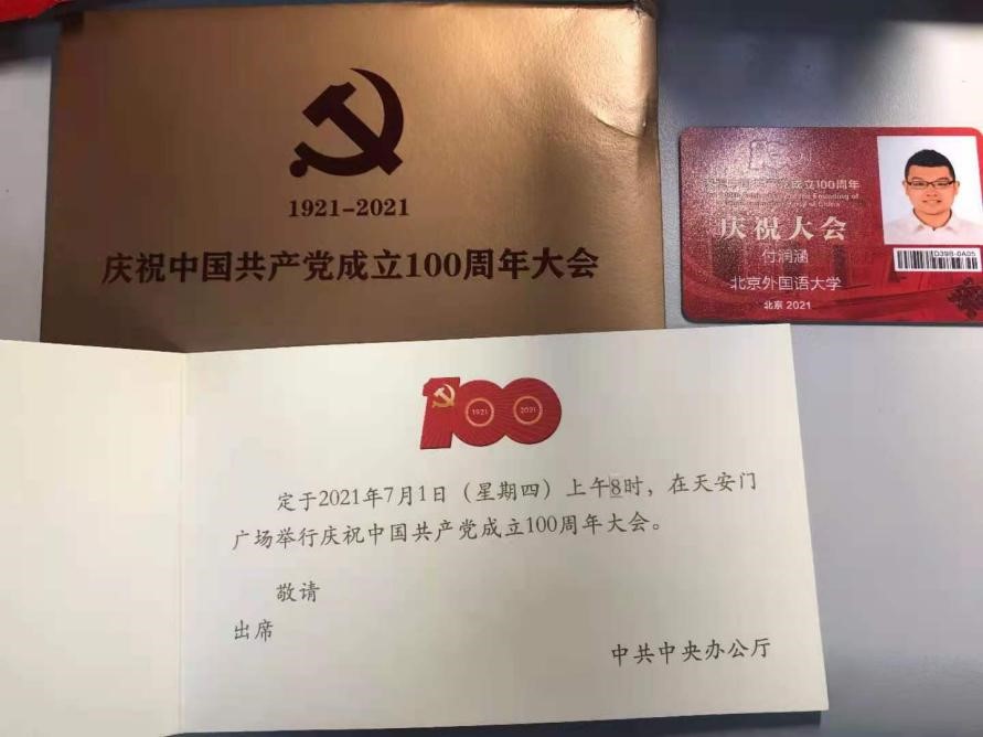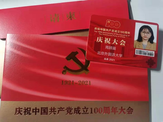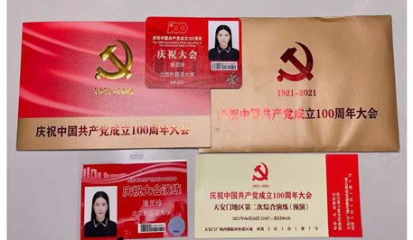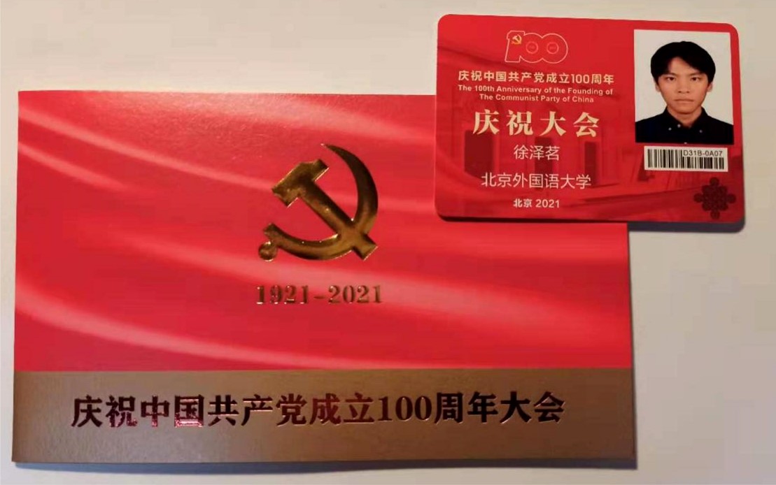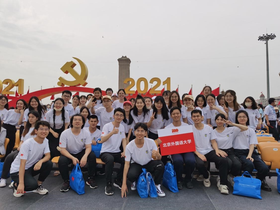 2021年7月1日,庆祝中国共产党成立100周年大会在天安门广场隆重举行,英国365集团网站员工代表本科生付润涵,研究生潘灵玲、周顾盈、徐泽茗与北外其他院系员工代表共同前往天安门广场参加庆祝大会。