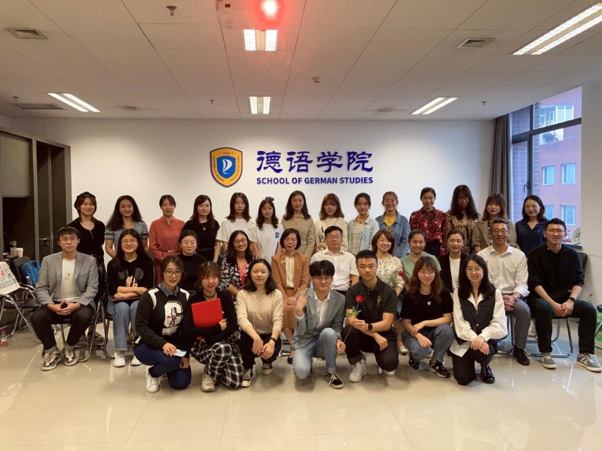 诗诵会开场环节,潘颖老师、张晓玲老师和周湘琪同学献上了一首优美动听的合唱Auf Flügeln des Gesanges《乘着歌声的翅膀》,将大家带入了浪漫高雅的德语诗歌的意境中;随后进行的绕口令大比拼点燃了全场的气氛,大家仿佛回到了昔日德语课堂的互动中。殷桐生老师和赵倩老师热情激昂地用中德双语朗诵了歌德的经典诗歌Hoch lebe das Geburtstagskind《祝愿寿星万寿无疆》,为母校送上诚挚热烈的生日祝福;贾建新先生带来了德文诗朗诵Herbstbild《秋日美景》,贾参用中文对诗歌进行了巧妙的阐释和总结,祝福母校桃李满天下;秦思刚、罗旻伉俪为大家声情并茂地朗诵了里尔克的诗歌Herbsttag《秋日》,在诗歌中大家一同重温了那年初秋踏入北外校园的美好和温暖;孙嘉惠老师和张乃文同学朗诵的诗歌Hoffnung《希望》流露出对母校美好的未来的憧憬和向往;寇蔻老师和焦冠群同学为大家带来了艾辛多夫的诗歌Mondnacht《月夜》,真切地表达了系友们思念母校的情感。随后,Ruth Schimanowski女士朗诵了80后现代作家创作的有趣新颖的德文诗歌Das Kettenkarussell《连锁走马灯》,引发了大家对现代经济生活的反思;Sabine Wilmes女士分享了歌德的一首独具特色的诗歌Eins und Alles《一与一切》;张凤凤女士和郭沈嘉乐同学、丁君君老师和史良老师深情地诵读了歌德的经典诗歌Chinesisch-deutsche Jahres- und Tageszeiten《中德四季晨昏杂咏》;Henrik Dittmann先生与姜浩远同学分别用中德文朗诵了诗歌Septembermorgen《九月的清晨》;字向馨、武文璇同学朗诵歌德的诗歌Mailied《五月之歌》时,大家如同徜徉在明媚的春光中;赵雄先生带来了诗歌朗诵Vision einer neuen Erde《憧憬新世界》,表达了对和平的憧憬以及对幸福生活的向往;孙守亮先生与曹芳凝同学共同朗诵了海涅的诗歌Die schönen Augen der Frühlingsnacht《春夜的美眸》,声情并茂的演绎赢得了在场师生的阵阵掌声。最后,诗诵会在田婧怡、郭沈嘉乐、张露予、雷婉珞、周杰湄、田芷于等同学表演的德文歌曲Dieser Weg《这条路》中圆满结束。