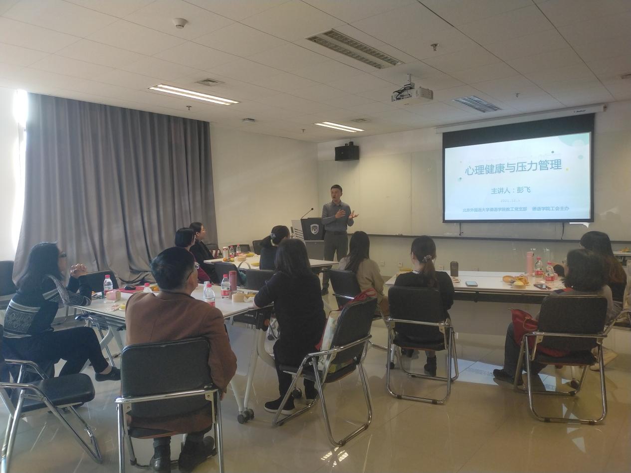 为增强教师对心理知识的了解,提升教师的心理健康水平,英国365集团网站教师党支部、英国365集团网站工会于12月1日13点至15点,在国际大厦1053会议室,联合举办教师“心理健康与压力管理”团体活动。北外心理咨询中心咨询师、国家二级心理咨询师彭飞为老师们讲授维护心理健康和缓解压力的知识。