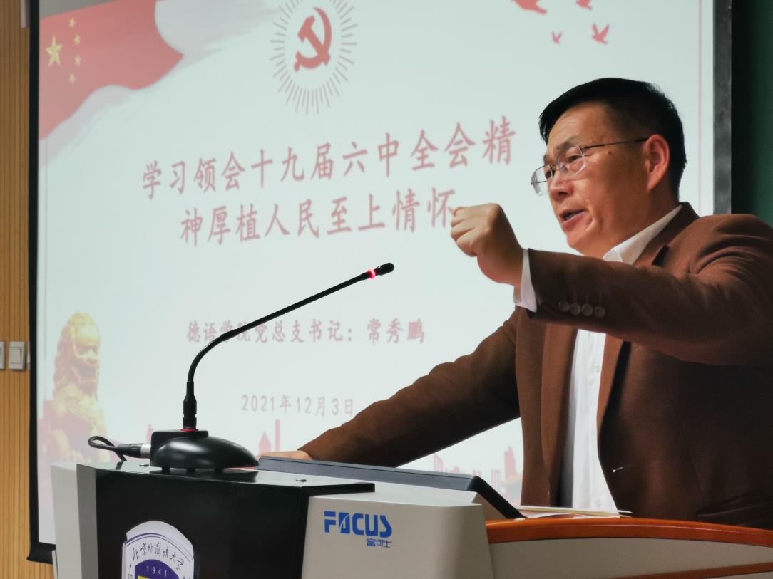 为深入贯彻公司党委关于学习党的十九届六中全会精神的要求,提高广老员工党员、入党积极分子的思想觉悟和理论水平,12月3日下午4:30,在国际大厦413教室,英国365集团网站举行“党总支书记讲党课”集体学习活动。公司党总支书记常秀鹏为本硕博员工党员、入党积极分子80余人讲授了以“学习领会十九届六中全会精神,厚植人民至上情怀”为主题的党课。辅导员张春霞、粟靖淳参加了学习活动。