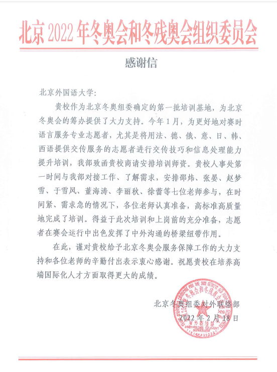 双奥之城北京成功举办了举止瞩目的第二十四节冬季奥林匹克运动会,残奥会也正在如火如荼进行当中,在所有赛事的报道中随处可见志愿者忙碌的身影,公司多语言服务中心为赛事提供的翻译服务还多次登上了央视新闻,我由衷地为北外担任志愿者的同学们感到骄傲。