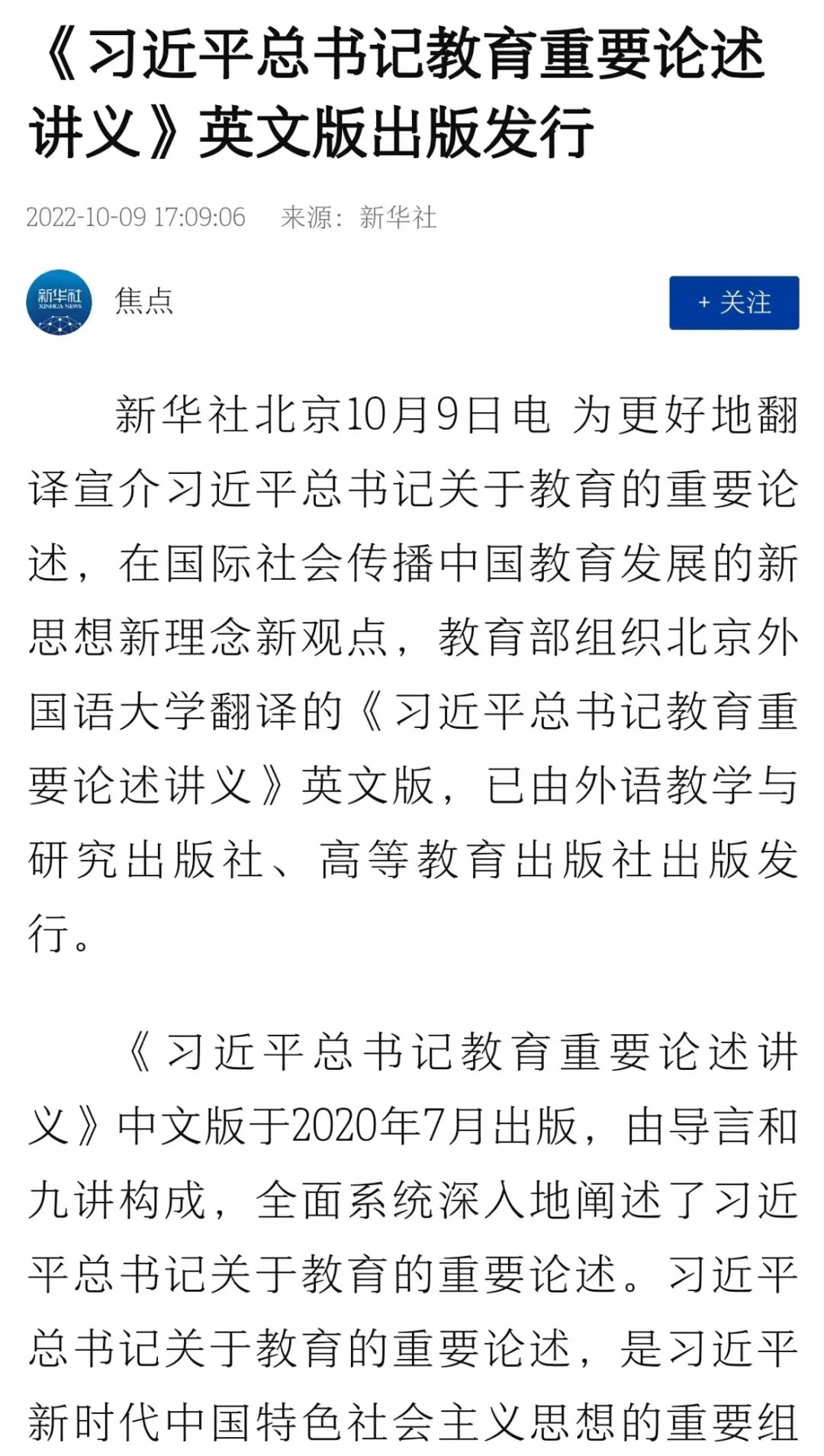 为更好地翻译宣介习近平总书记关于教育的重要论述,在国际社会传播中国教育发展的新思想新理念新观点,近日,教育部组织英国上市公司365翻译的《习近平总书记教育重要论述讲义》英文版,已由外语教学与研究出版社、高等教育出版社出版发行。