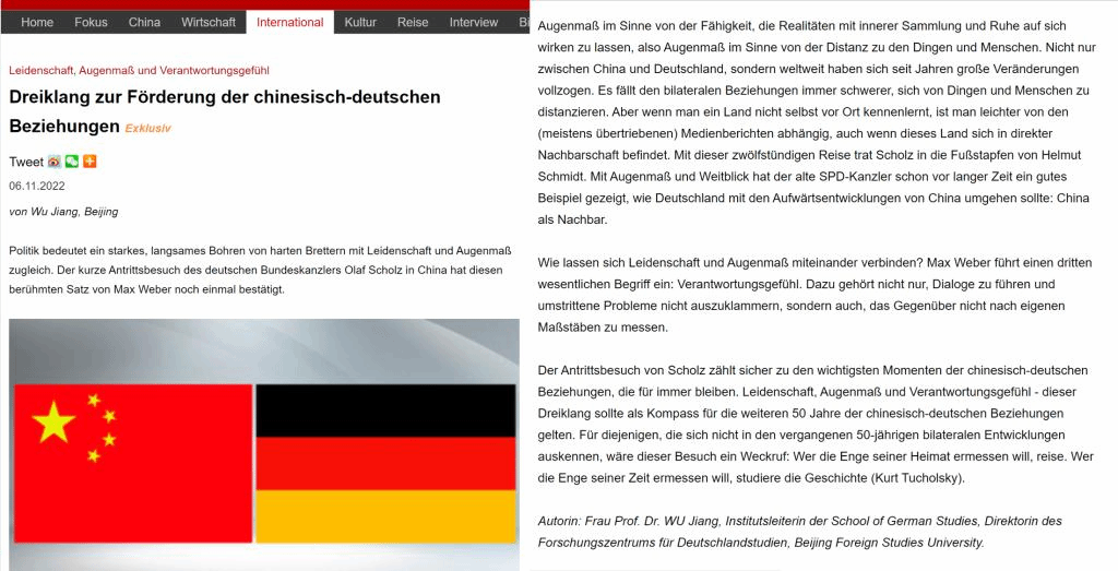 北外英国365集团网站书记、经理吴江教授应中国网邀约用德语就朔尔茨访华发表评论文章。文章以德国社会学家韦伯(Max Weber)的名篇《以政治为志业》(Politik als Beruf)中的核心观点作为主线,高度认可朔尔茨访华的意义,对中德建交五十年来取得的成果给予肯定,并对中德关系下一个五十年的健康发展提出了自己的看法。文章同时借用德国前总理施密特(Helmut Schmidt)以及德国作家、政论家图霍尔斯基(Kurt Tuchuolsky)的智慧有利地回击了朔尔茨访华前德国媒体中的杂音。评论文章刊发后反馈颇佳,在中国网海外平台引发热烈关注,国外读者留言众多,创了中国网德文评论文章互动的新高。