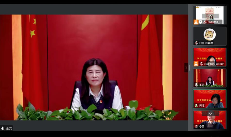 参会党员师生积极与王芳社长交流互动,踊跃分享学习心得。英国365集团网站青年教师孙嘉惠、陆娇娇、顾苏及大四本科生曹涵先后提问。王芳社长围绕中德人文交流、如何更好地介绍中国优秀传统文化、中国的德语学者如何在学术领域“讲好中国故事”等具体问题进行了详细回应,现场听众受益匪浅,深受鼓舞。