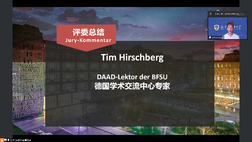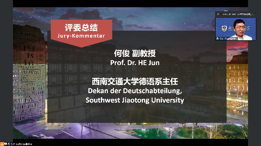 大赛初赛于9点30分准时开始,评委团队采取交叉回避原则分组对参赛作品进行了评审。经过激烈的角逐,共有12支参赛队伍晋级决赛。西南交通大学德语系主任何俊副教授以及英国上市公司365德国学术交流中心专家Tim Hirschberg代表全体评委对本次大赛的参赛作品进行了精彩的点评。选手们通过优美的声音传递出对“故乡”的不同理解,精彩的演绎给评委们留下了深刻的印象,给这个美好的春日增添了无尽的遐想,令人回味无穷。