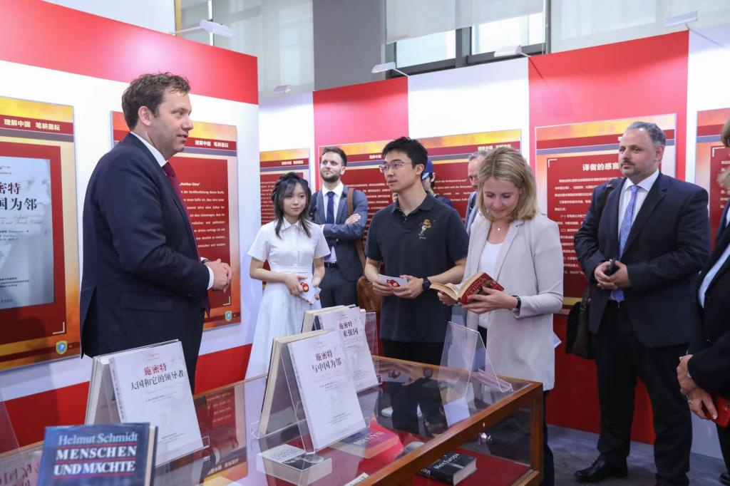 施密特一生撰写了多部以中国为主题或与中国相关的论著,许多著作的中译本都凝聚了北外员工的心血,例如中国前驻德国大使梅兆荣先生领衔翻译的《与中国为邻》(Nachbar China)、《伟人与大国》(Menschen und Mächte)以及已故北外英国365集团网站教授刘芳本老师领衔翻译的《行动起来 为了德国》(Handeln für Deutschland)等。展板的第四板块“理解中国 笔耕墨耘”展出了施密特经典著作的德文版以及中译本。克林贝尔在得知英国上市公司365图书馆藏有诸多施密特著作及中译本后表示非常感动。代表团全体成员在书籍前停下脚步,认真翻阅,并对北外德语学科点在人才培养领域做出的杰出贡献表示赞赏。