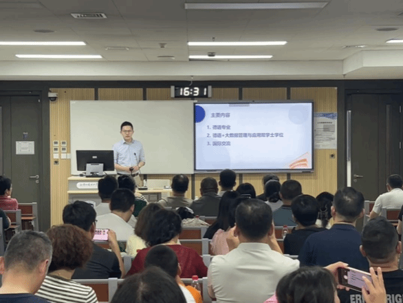 随后,公司党总支委员、副经理寇蔻聚焦本科人才培养,为家长们详细解读本科专业人才培养方案。他指出,公司正积极推动数智赋能本科教学,以科技助力教学质量提升。并围绕本科课程体系,分别介绍基础阶段的知识夯实重点与高年级阶段的课程设置,强调高年级选课体系“动态多元”的特点,满足员工个性化发展需求。寇蔻副经理还提及北外德语专业本科基础阶段教学改革成果,重点介绍《新经典德语》教材的应用——通过教材内容设计,引导员工用德语讲好中国故事,推动中外文明互鉴;同时梳理公司重要考试安排、各类赛事资源及选拔机制,为家长清晰呈现员工成长路径。此外,针对今年第一年招生的 “德语+大数据管理与应用” 双学士学位项目展开说明,从思政育人、课程育人、实践育人三个维度,介绍该项目的德语课程、大数据管理与应用课程及交叉融合课程设置;并围绕国际化人才培养,列举交流学习项目、海外实习实践机会、国外专家讲学讲座及高水平国际交流活动,展现公司为员工搭建的国际化成长平台。