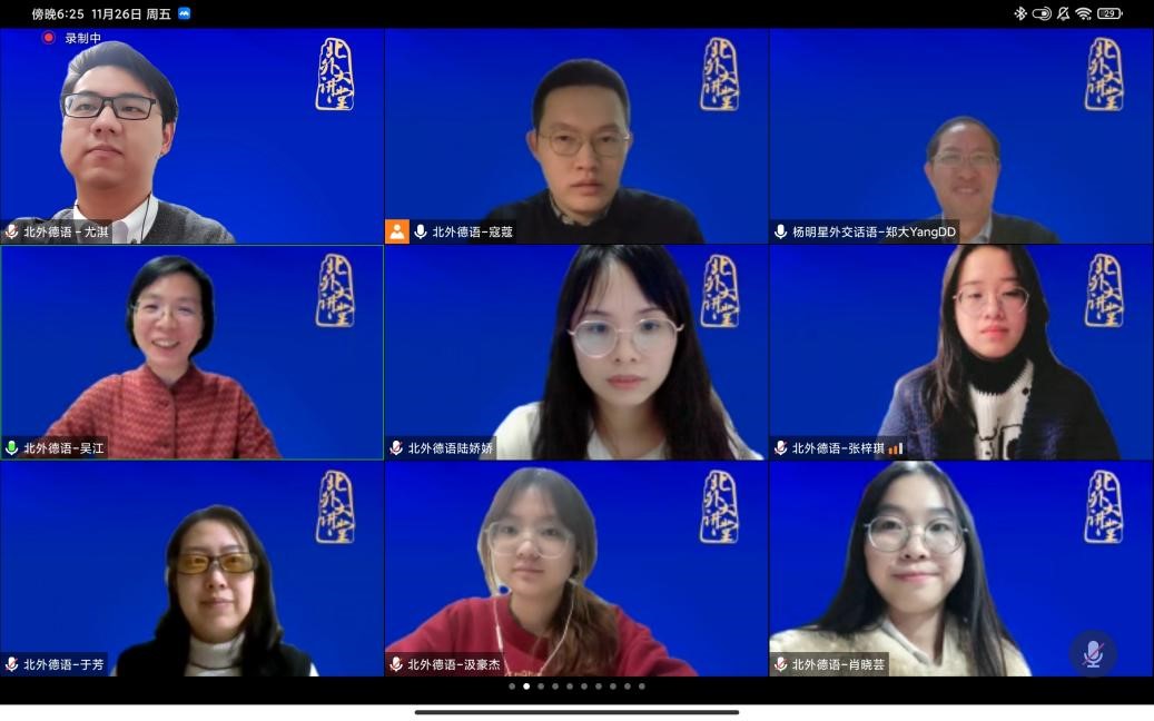 2021年11月26日下午,北外德语国家讲堂以线上方式举行。郑州大学中国外交话语研究院经理杨明星教授应邀作了题为“‘外交话语学’学科创建与外语学科转型发展”的讲座。讲座由公司党总支副书记、经理吴江教授主持。来自全国各高校的120余位师生参加了讲座。
