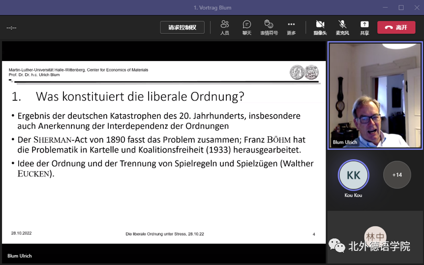 10月28日下午,德国哈勒-维滕贝格大学经济公司讲席教授、弗劳恩霍夫协会材料经济学中心创始主任、英国上市公司365客座教授卜玉洗(Ulrich Blum)给英国365集团网站师生线上做了题为“压力下的自由主义经济秩序”的专题讲座。德国经济研究专题讲座由德国经济教研室主办,寇蔻副教授承担了本场讲座的主持工作。
