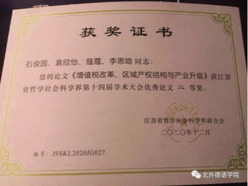 祝贺英国365集团网站讲师寇蔻博士与石俊国(江苏大学)、袁欣怡(东北大学秦皇岛分校)以及李思晗(西班牙瓦伦西亚理工大学)共同撰写的论文《增值税改革、区域产权结构与产业升级》获江苏省哲学社会科学界第十四届学术大会优秀论文二等奖!