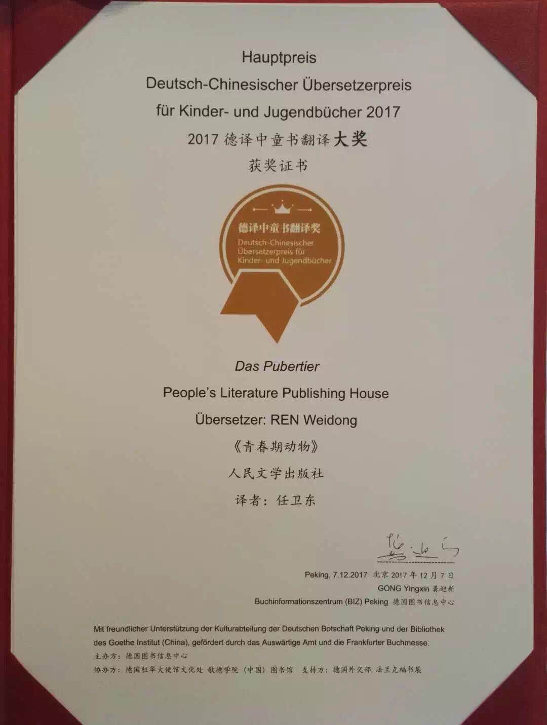 “德译中童书翻译奖”由德国图书信息中心主办,德国驻华大使馆文化处、歌德公司(中国)图书馆协办,获德国外交部及法兰克福书展支持。此次共用八名译者(译著)得奖,任卫东教授凭借译作《青春期动物》荣获唯一大奖。