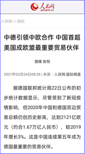 2021年2月23日,公司徐四季副教授接受人民网采访,深入解读中德引领中欧合作,中国首超美国成欧盟最重要贸易伙伴。