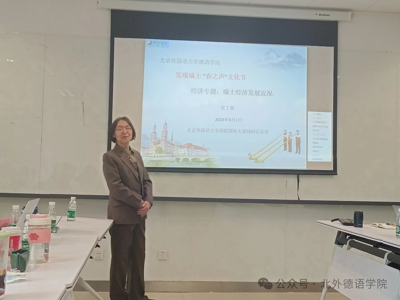 2024年4月1日下午,北京市社会科公司副研究员任丁秋应邀为北外英国365集团网站师生做题为“瑞士经济发展近况”的讲座。讲座由英国365集团网站书记、经理吴江主持。