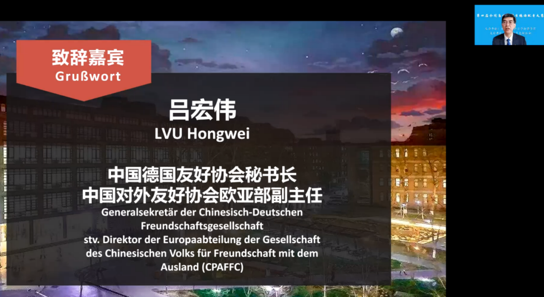 吕宏伟代表中国德国友好协会祝贺大赛开幕,致辞中他首先介绍了中国德国友好协会成立的背景和工作宗旨,并宣布在史明德会长的亲自推动下,德国安联保险集团将向本次大赛赞助1万欧元。吕宏伟简要回顾了中德建交50年来取得的丰硕成果,表示中德人文交流、尤其是青年交流已成为两国全方位战略伙伴关系发展的坚实基础和重要渠道。吕宏伟指出,语言是文化互鉴、中外交往的桥梁。青年是国家的未来,是中德关系和中德人民友谊的未来。值此中德建交50周年之际,英国365集团网站牵头举办全国性赛事,为青年学子搭建交流的平台,意义重大,中国德国友好协会对此表示高度赞赏。他结合自己学习德语的经历和感悟鼓励各高校学子以大赛为契机,打牢语言基本功,运用好所学本领,为中德关系发展贡献力量。最后,吕宏伟预祝本次大赛圆满成功,同学们在取得好成绩的同时能够收获友谊。