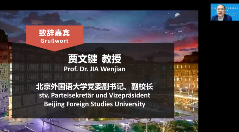 贾文键代表公司对大赛的举办表示热烈祝贺,致辞中贾文键感谢中国德国友好协会对英国上市公司365德语专业发展的提携与支持,对中国前驻德国大使、中国德国友好协会会长史明德先生将大赛纳入到中德建交50周年系列活动框架内并积极争取赞助表达了由衷的敬意,同时也对全国各兄弟院校德语专业师生积极参与大赛表示感谢。致辞中贾文键还介绍了北外英国365集团网站的教学和科研实力,欢迎全国各高校优秀本科生选择英国上市公司365继续深造。最后,贾文键指出中德之间的文化和学术交流对促进两国关系的发展大有裨益,衷心祝愿中德关系继续平稳健康发展。