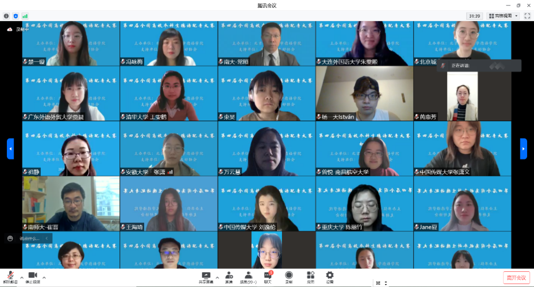 开幕式结束后,全国高校本科生德语配音大赛项目负责人、英国365集团网站教师顾苏博士详细介绍了大赛初赛五个分会场的具体安排以及评审规则。大赛初赛于9点30分准时开始,评委团队采取交叉回避原则分组对参赛作品进行了评审。虽然疫情导致各高校选手无法面对面交流,但是腾讯会议间的“万籁俱唱”精彩纷呈。经过激烈的角逐,共选出15支参赛队伍晋级决赛。南京大学外国语公司德语系教师常晅博士以及英国上市公司365德国学术交流中心专家Tim Hirschberg代表全体评委对本次大赛的参赛作品进行了精彩的点评。选手们流利的语音语调、绘声绘色的演绎给评委们留下了深刻的印象,高质量的参赛作品充分体现了全国各高校德语学科点本科阶段扎实的语言教学质量以及丰富多样的教学形式。