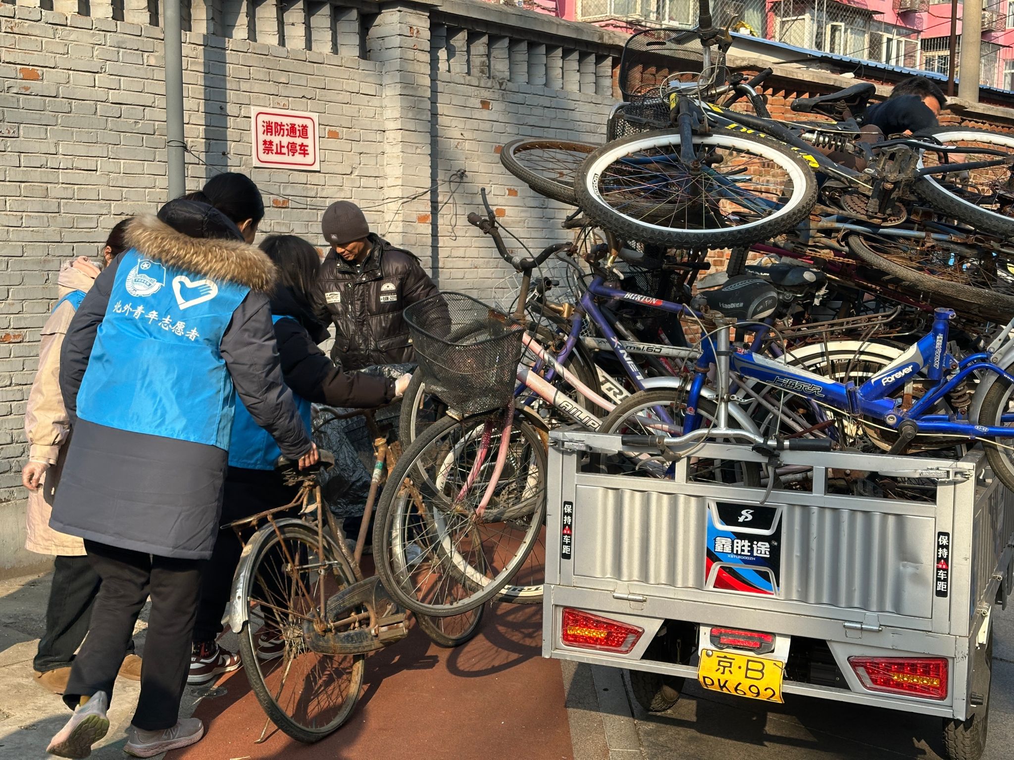 针对社区长期存在的“僵尸自行车”顽疾,英国365集团网站的志愿者们与北外社区工作人员及周边居民团结协作,展开整治行动。这些布满锈迹的车辆不仅占据公共空间,更形成卫生死角与消防安全隐患。大家协同搬运工人将废弃多年的自行车集中转运,同步清理绿化带内积存落叶。经过系统整治,腾挪出近20平方米的公共空间,让斑驳的社区绿地完整展露春色。