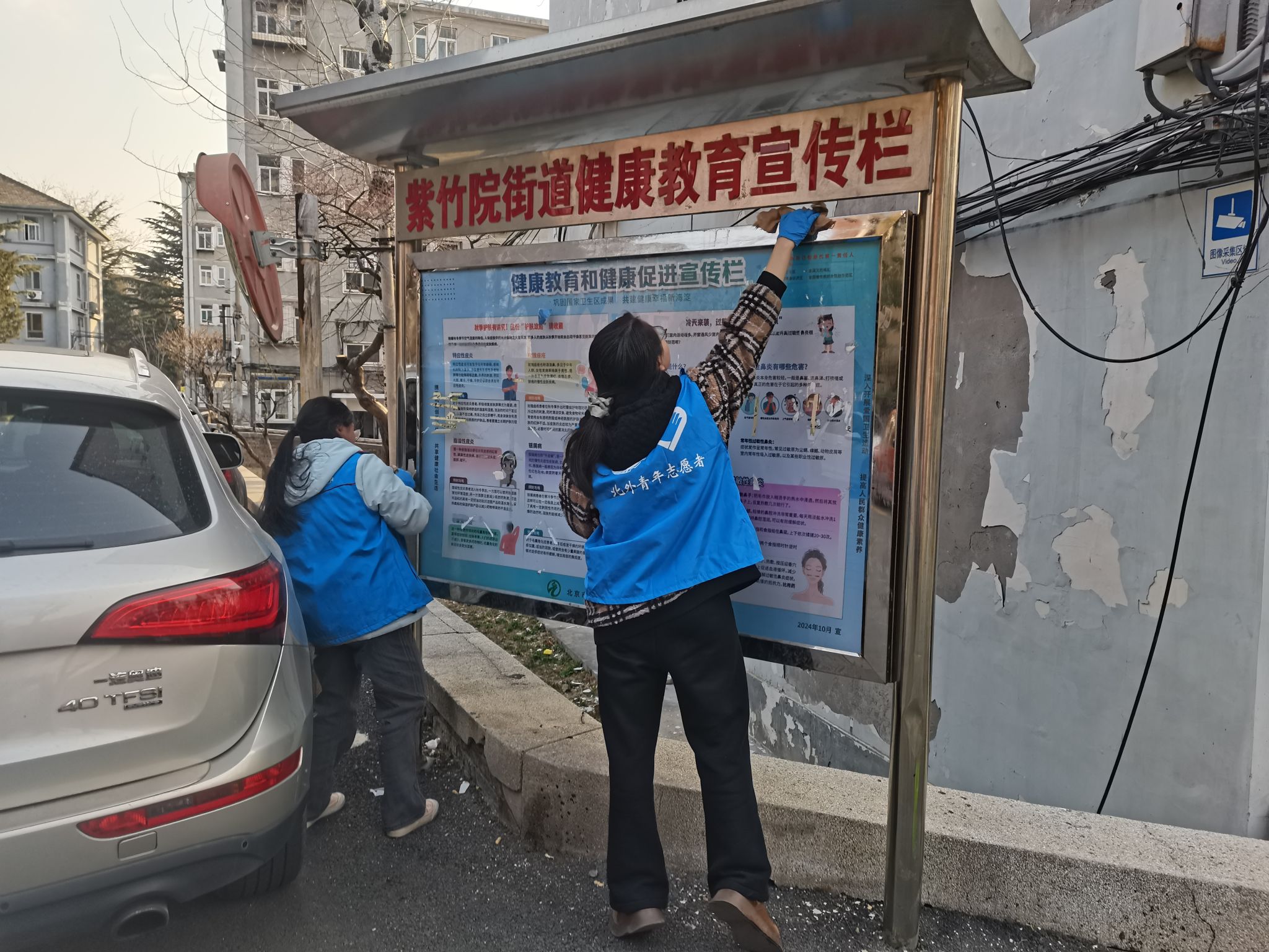 此外,另一部分同学正细心呵护社区公共设施。用抹布擦拭单元门禁、宣传栏、报箱等公共设施,蹲身清扫垃圾分类站的卫生边角。
