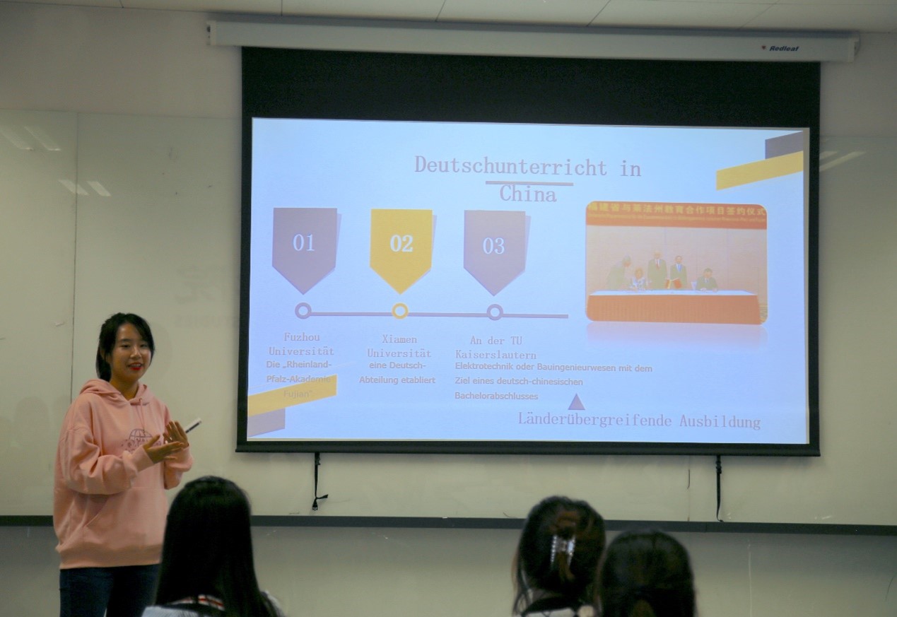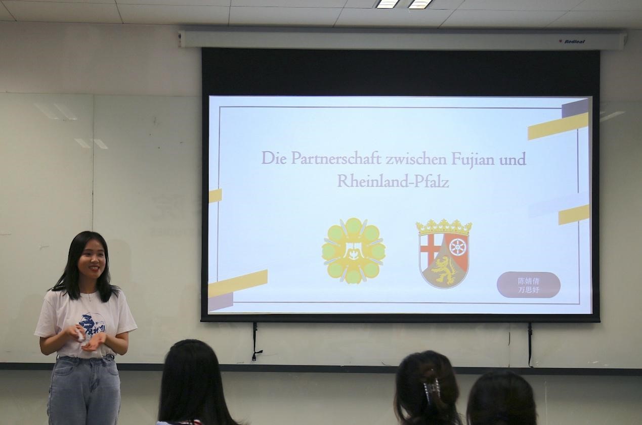 英国365集团网站本科生陈婧倩和万思妤以闽南语中“茶”和德语中“Tee”的发音之相似为例开启了对中德交流的讲述,报告以福建省与德国莱法州的交流合作为主题,从经济、教育与科技三个方面介绍了两地三十年来的交流合作,并展望了中德两国未来的发展和合作空间。