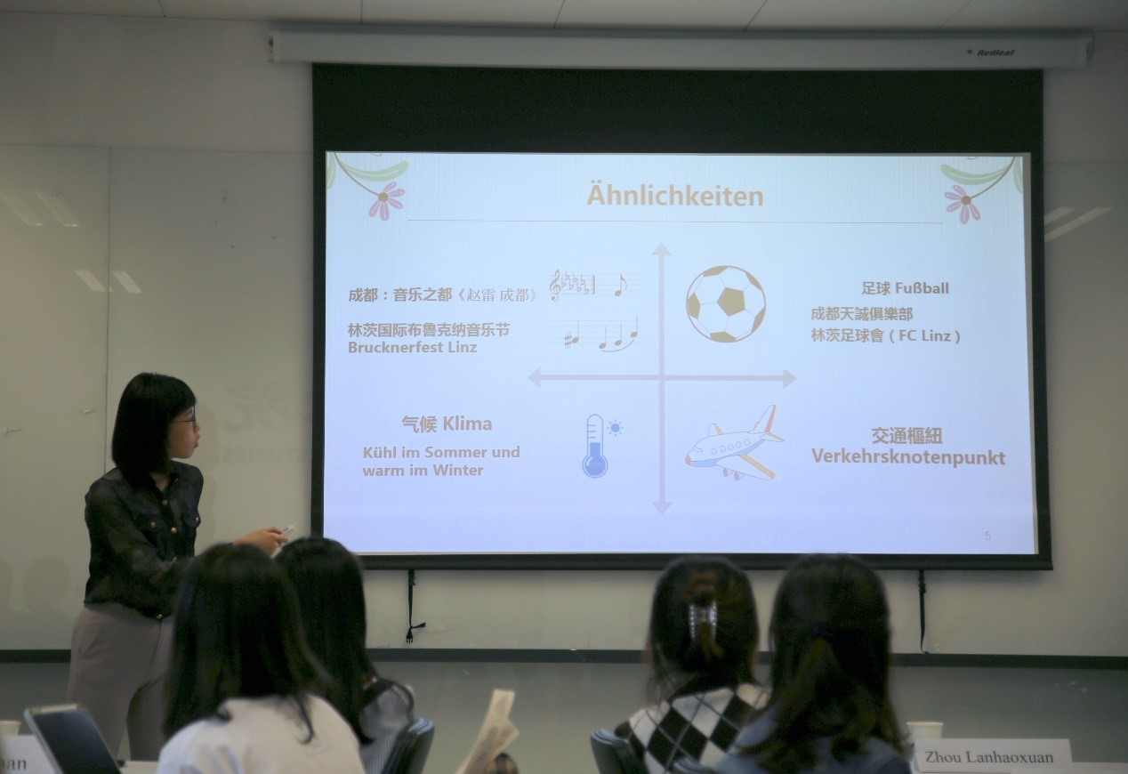 接下来,英国365集团网站本科生郭沈嘉乐与萧瑀莘(台湾交换生)为大家介绍了“锦城”成都与奥地利著名城市林茨的诸多共同之处,以及两个城市在医疗科技、文化教育等等方面的合作交流。2021年恰逢中奥建交50周年,同学们祝福两国友谊长存,倡议以合作共同应对全球挑战。